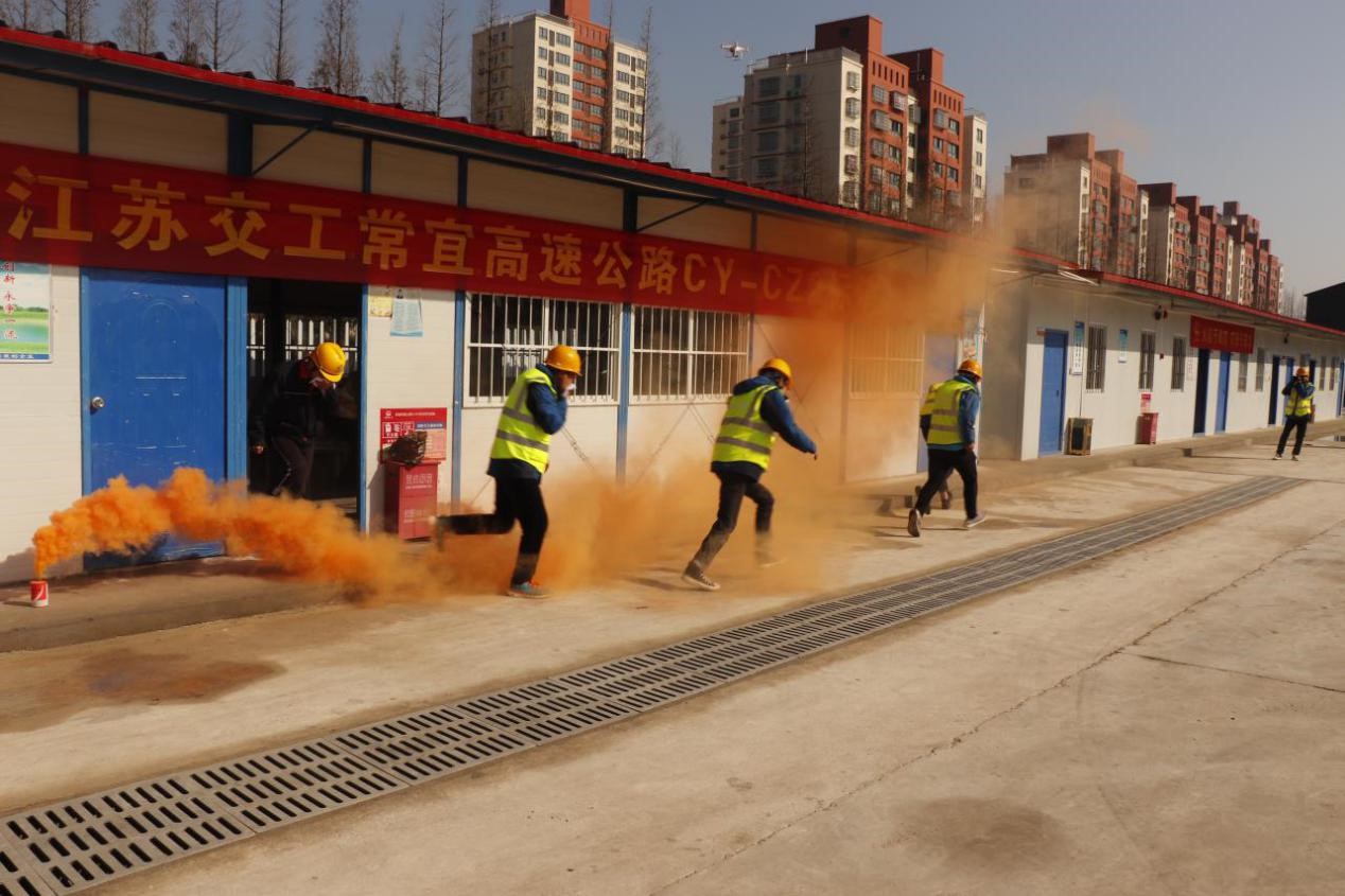 一阵急促的电铃声在常宜高速常州1标预制场生活区骤然响起,顿时浓烟滚滚,这时有人大喊:“着火啦!”,正在房间内的人员纷纷用毛巾捂着口鼻有序向外奔跑。原来这是日前常宜高速公路(常州段)举办的消防应急演练。