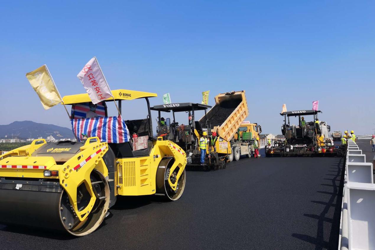 10月20日,伴随着沥青拌合楼的激情咆哮声,路泽太路面标三只沥青施工队伍桥上桥下同步施工,火力全开,单日累计完成8000多吨沥青混合料摊铺工作,沥青面层施工长度多达4公里。