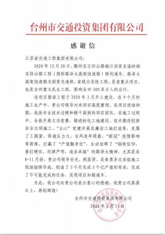 日前,台州市交通投资集团有限公司专程发来感谢信,对集团公司优质高效完成路泽太项目建设给予了充分肯定和褒奖。
