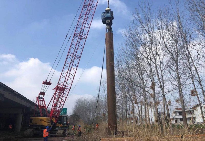 沪陕高速平广扩建段引河大桥栈桥首根钢管桩成功插打