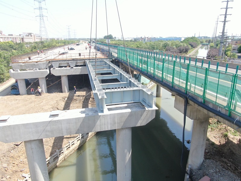 6月15日,随着迎宾大道分离式立交左幅第四联最后一块钢结构梁体吊装任务的顺利完成,京沪高速公路扩建工程沭阳3标段主线左幅实现全线贯通。
