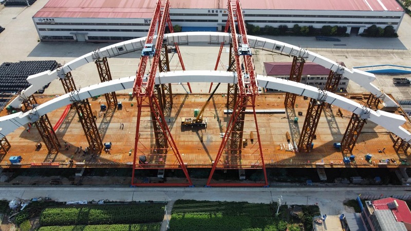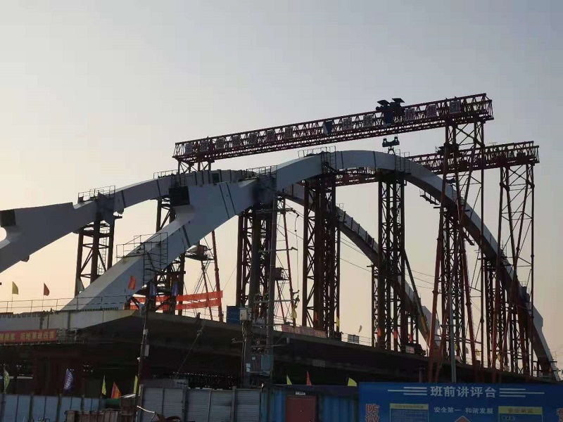 目前桥面系及拱肋已经顺利吊装完成,水中3组临时墩施工已经全面展开。下一步,项目部将安装风撑及附属结构,预计8月下旬开始整桥步履式顶推过河。