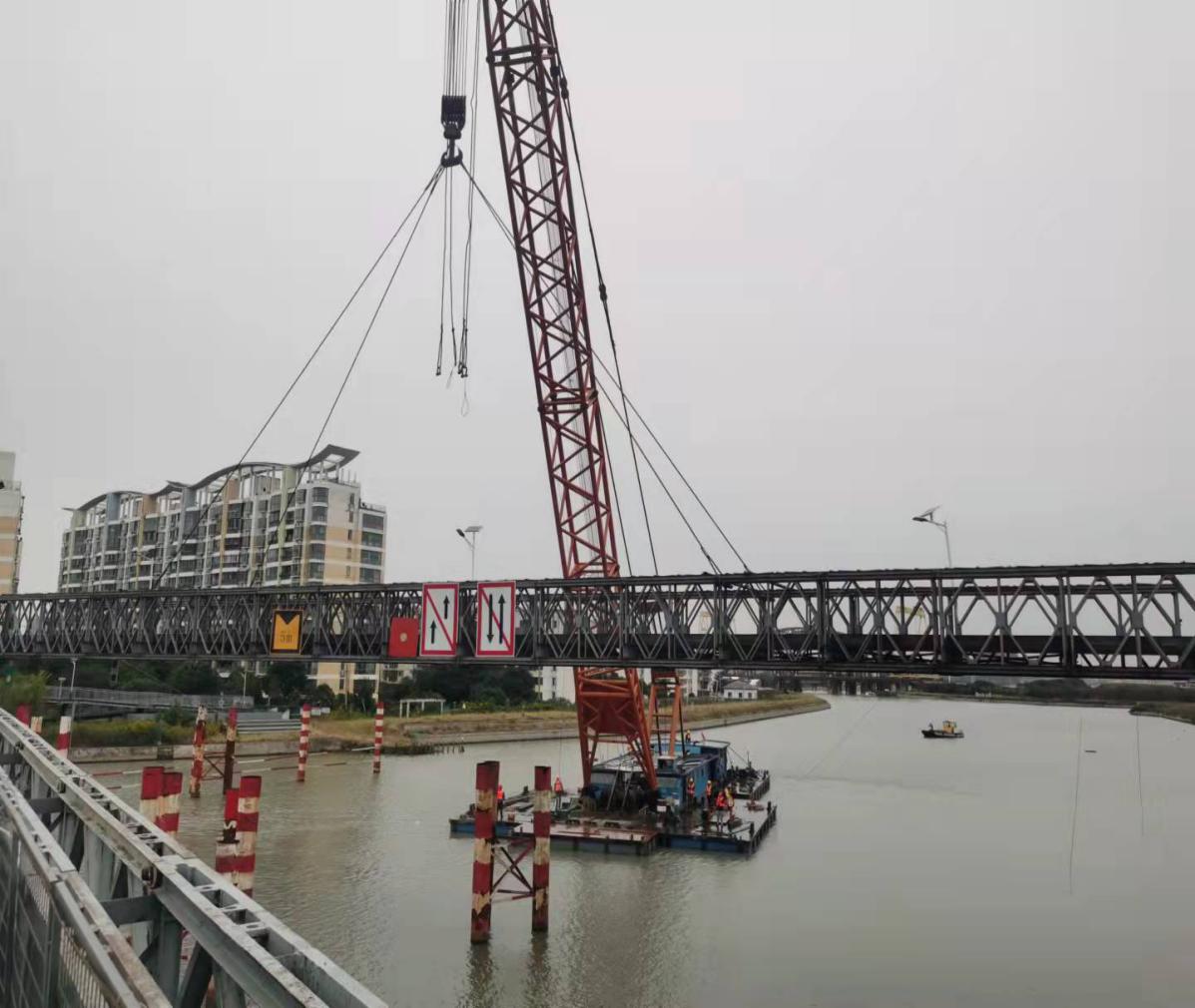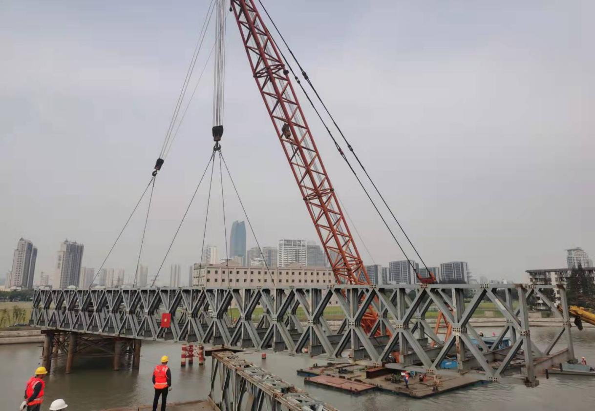 据了解,车行钢便桥通航孔段采用的是CD型双排双层带第三弦杆结构,单跨桥长54.864米,桥面通行宽度7.4米,荷载双车道城市—B级;人行钢便桥通航孔段采用的是HD200型双排单层,中间两节高抗弯、两端两节高抗剪结构,单跨桥长48.768米,桥面通行宽度4.2米,荷载人群3.5KN/m2。经现场查看,发现航道上过往船舶较多,封航时间短,严重影响施工。为此,项目部多次优化施工方案,精心组织严控流程,最终吊装过程整体结构平稳,所有构件的任何部位未发生变形损伤,完全可以再次架设使用。