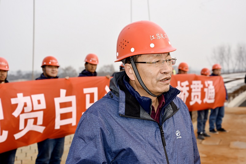仪式现场,开通公司副总经理、白马湖大桥项目经理徐安吉代表江苏交工接受淮安市电视台采访。他表示,项目部将继续发扬江苏交工能打仗、打硬仗的铁军精神,认真组织全桥面系、锁具、护栏等附属工程的施工,确保4月底实现全桥通车。