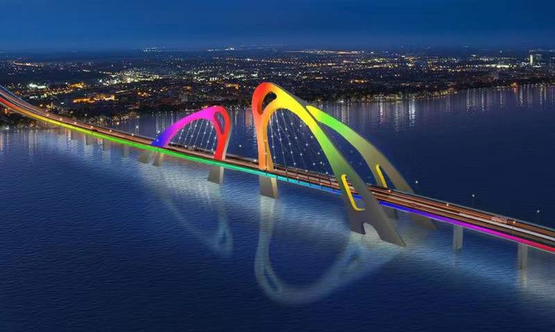据了解,白马湖大桥主桥长246米,宽37米,作为白马湖旅游度假区内重要的基础设施之一,其设计灵感来源于《辛氏三秦记》中的“鱼跃龙门”,一大一小两座拱塔宛若跃出湖面的白色双鱼,美观奇特,而三维曲面的“双鱼”拱桥也被业内专家定义为拱桥最高难度序列。建成后,该大桥将成为淮安的城市新地标,同时串联白马湖片区北部旅游度假区核心区和南部白马湖国家湿地公园核心区、向日葵的故事景区,推动白马湖景区形成区域内“20分钟旅游交通圈”,加快实现白马湖景区融入长三角2小时经济圈的目标。