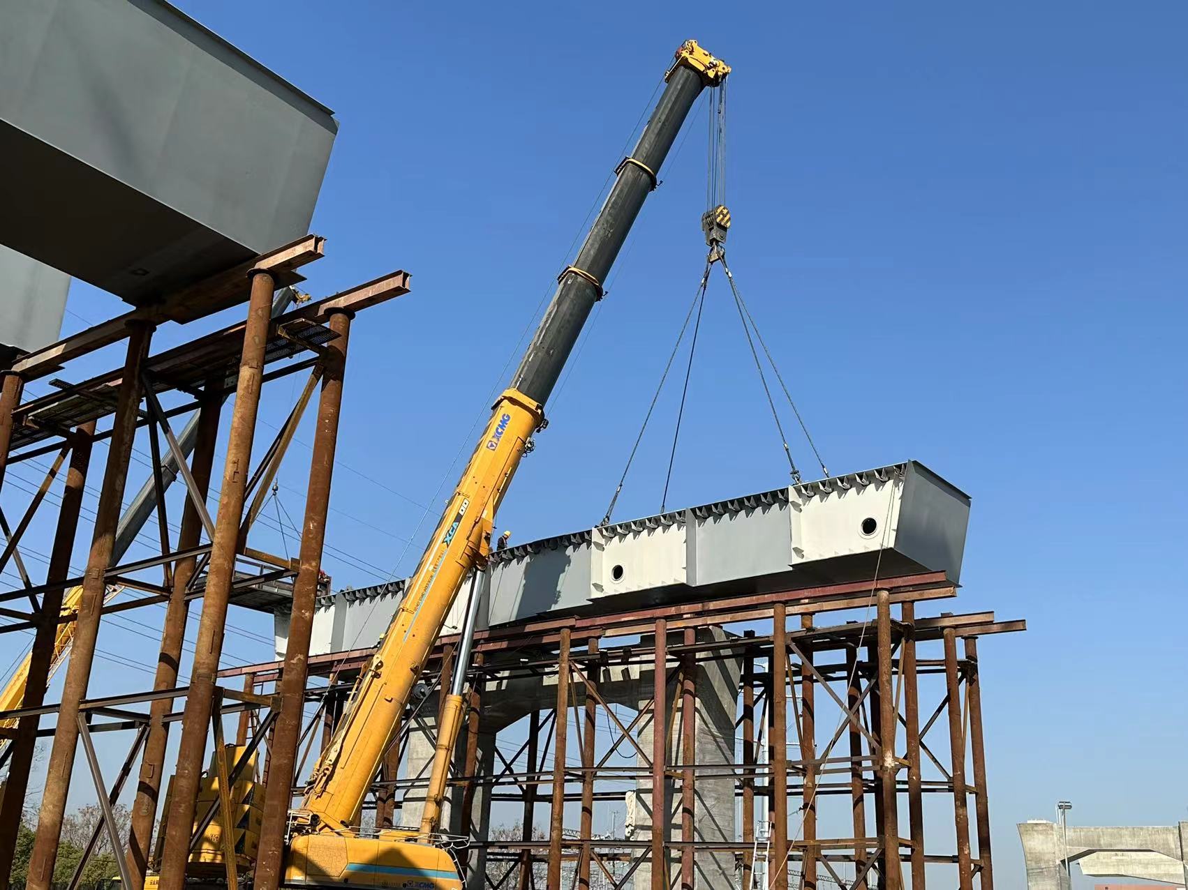 312国道无锡飞凤路至金城东路段改扩建工程位于新吴区内,起于望虞河北岸飞凤路南侧,沿现312国道老路线向北至金城东路北侧新吴区、锡山区交界处,路线全长约17公里,312国道改扩建工程新吴段11标全长4.8公里,由集团公司承建。长江东路是新吴区的一条交通主干道,周边工业园区密集、企业众多,来往车流量大。为了保证不中断交通的情况下施工架设完成,项目部多番考虑,采用钢箱梁在现场直接搭建架设的方式。上跨长江东路钢箱梁总长140米,总重约3000吨,首联钢箱梁架设完成使主线南北侧贯通,也标志着全面进入桥面系施工。