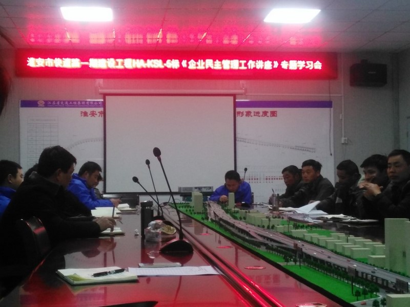 12月9日晚6:30时,淮安市快速路一期建设工程开通公司5标项目部,组织全体管理人员进行《企业民主管理工作讲座》专题学习,会议由项目常务副经理吴春勇主持。学习过程中,大家相互讨论,畅所欲言。通过学习,使广大员工进一步认识企业民主管理工作的重要性和必要性。(刘建飞)
