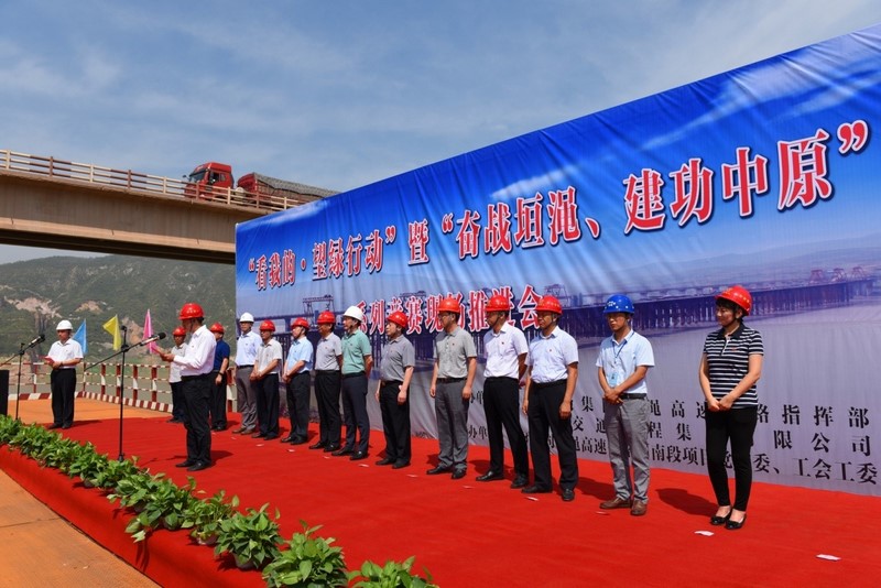 8月11日上午,河南省三门峡市黄河特大桥项目7号平台上彩旗飘扬,人头攒动,“加快建设垣渑高速公路项目,迎接党的十九大胜利召开”“打造垣渑精品工程、共筑绿地百年基业”“展示江苏交工风采、彰显绿地集团形象”等一条条展示信心、催人奋进的横幅标语悬挂在施工现场不同区域,党员先锋工程、党员突击队、青年突击队的鲜红旗帜迎风飘扬。由绿地城投集团垣渑高速公路指挥部和开云手机版登录入口联合主办的“垣渑高速公路‘看我的·望绿行动’暨‘奋战垣渑、建功中原’系列竞赛现场推进会”在这里隆重举行,吹响了垣渑高速公路项目大干快上的集结号。
